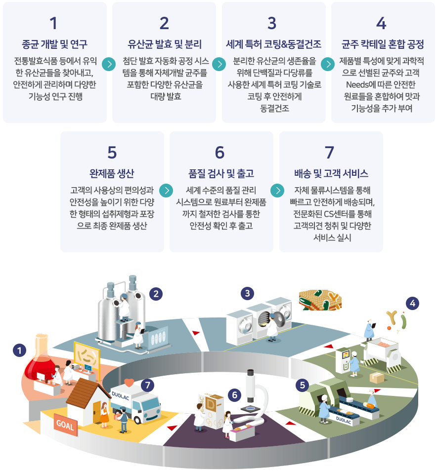 연구, 종균개발, 임상, 생산, QC, 수출, 판매, 고객관리까지